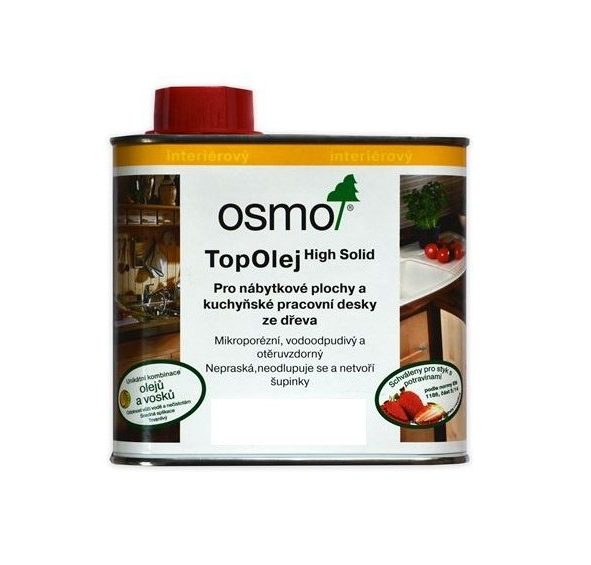 OSMO – TOP OLEJ je špeciálna kombinácia oleja a vosku na bezfarebnú úpravu povrchu nábytku a pracovných dosiek (napr. kuchynských). Náter sa vyznačuje tvrdosťou a odolnosťou povrchu a má veľmi ľahkú údržbu.