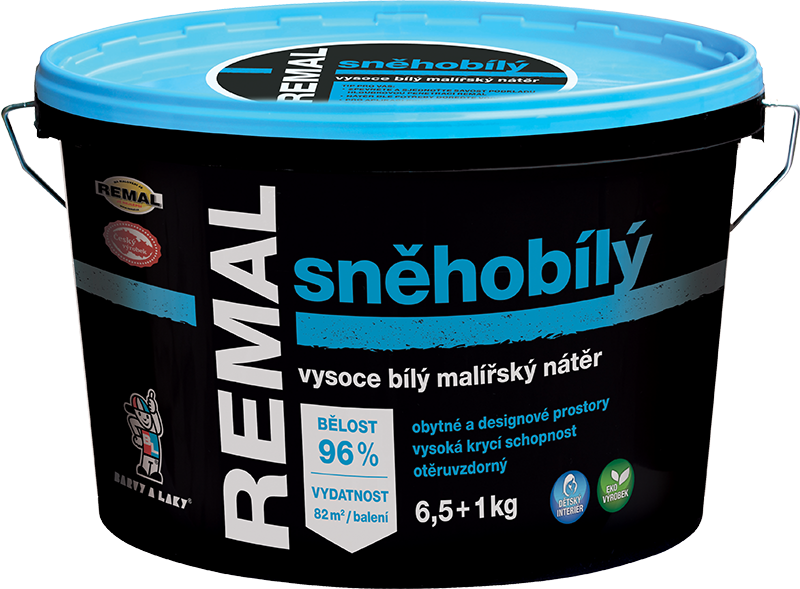 REMAL SNEHOBIELY je vodouriediteľná maliarska farba s vysokou bielosťou. Výborne kryje, je paropriepustná, oteru vzdorná a má vysokú bielosť 96%. Používa sa v interiéroch na maľovanie omietok, betónu, sadrokartónu, cetris dosiek, drevotriesky a sanačných omietok. Farba vykazuje odolnosť proti oteru za mokra – merané podľa ČSN EN ISO 11998 – trieda 5 (klasifikácia podľa EN 13300).